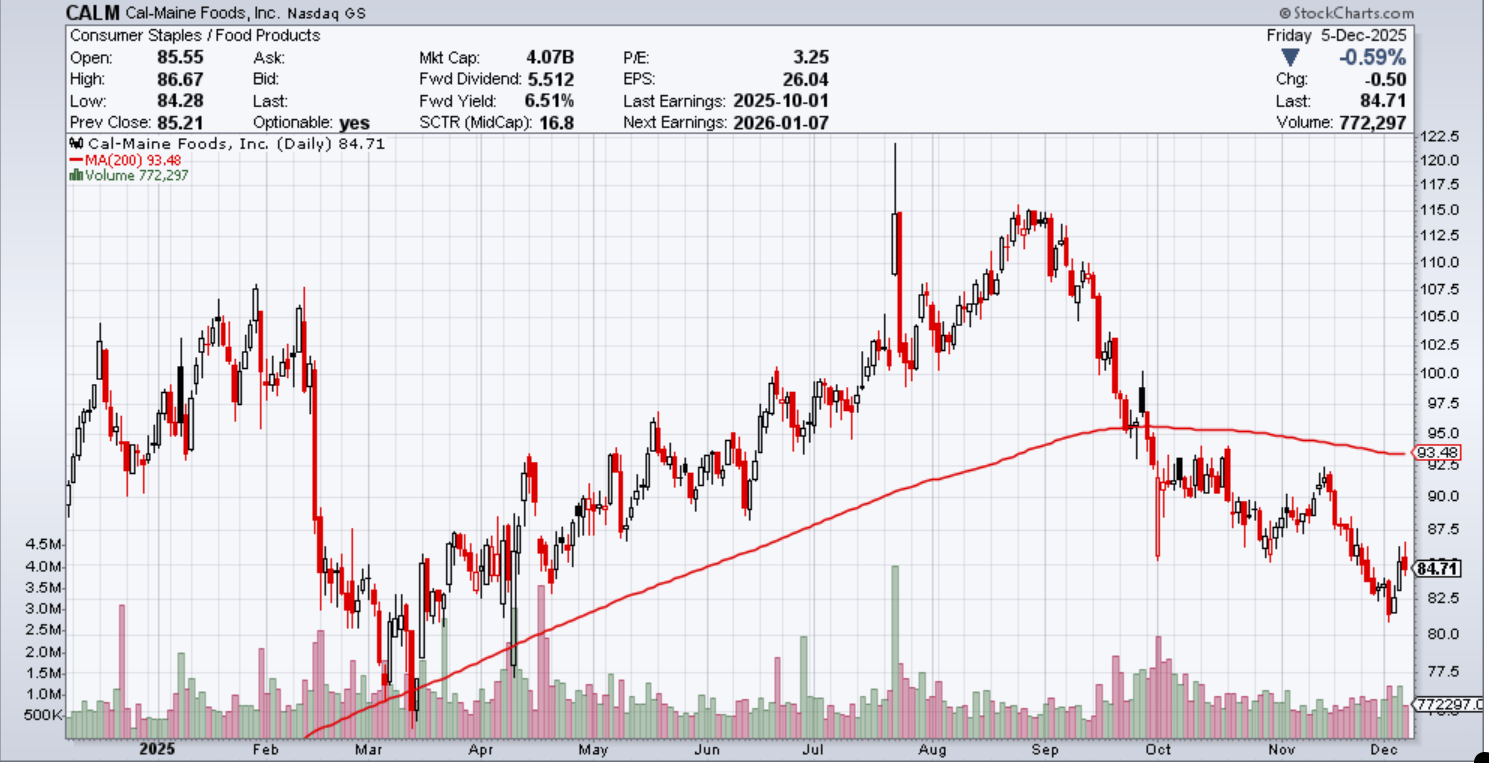 Result: egg prices exploded, and Cal-Maine's earnings went from $2.72/share (FY2021) to $25.04/share (FY2025). The stock is down 14% from highs as egg prices have dropped sharply from peak levels but they remain elevated vs. historical norms.