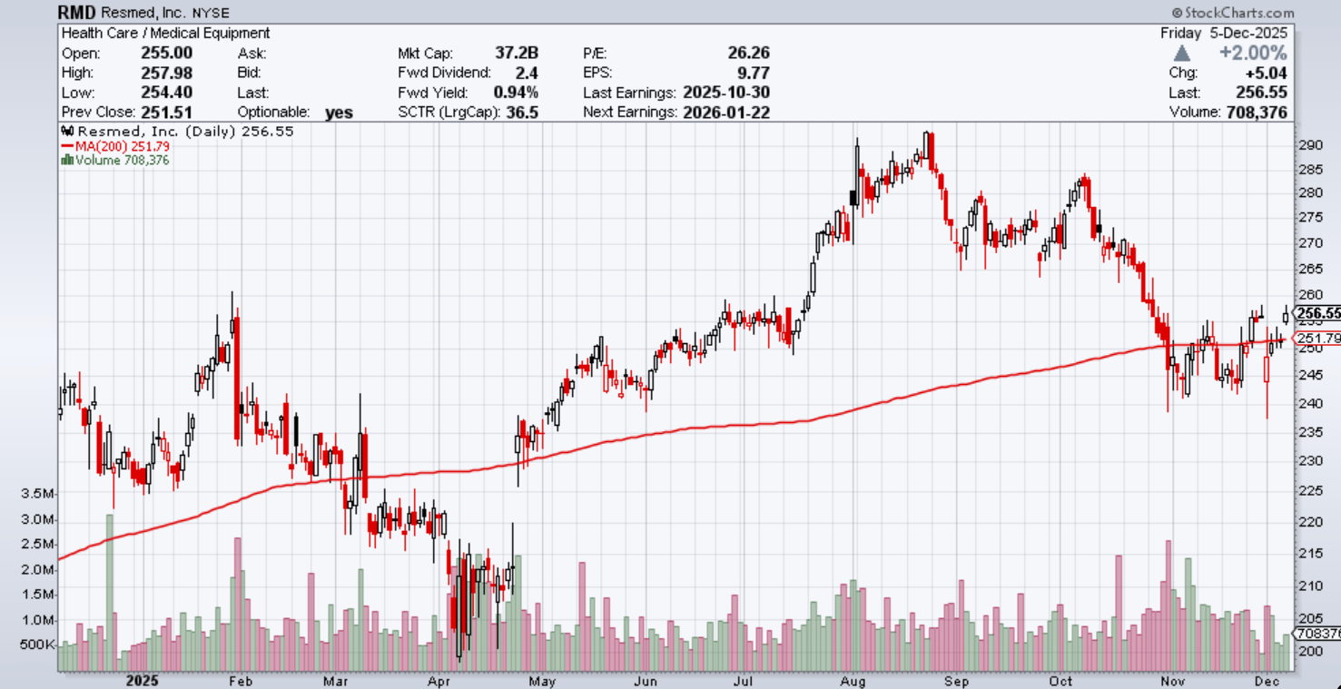 This is the most controversial name on the list. The bear case is simple: GLP-1 weight loss drugs (Ozempic, Zepbound) could cure obesity-driven sleep apnea, shrinking ResMed's market.