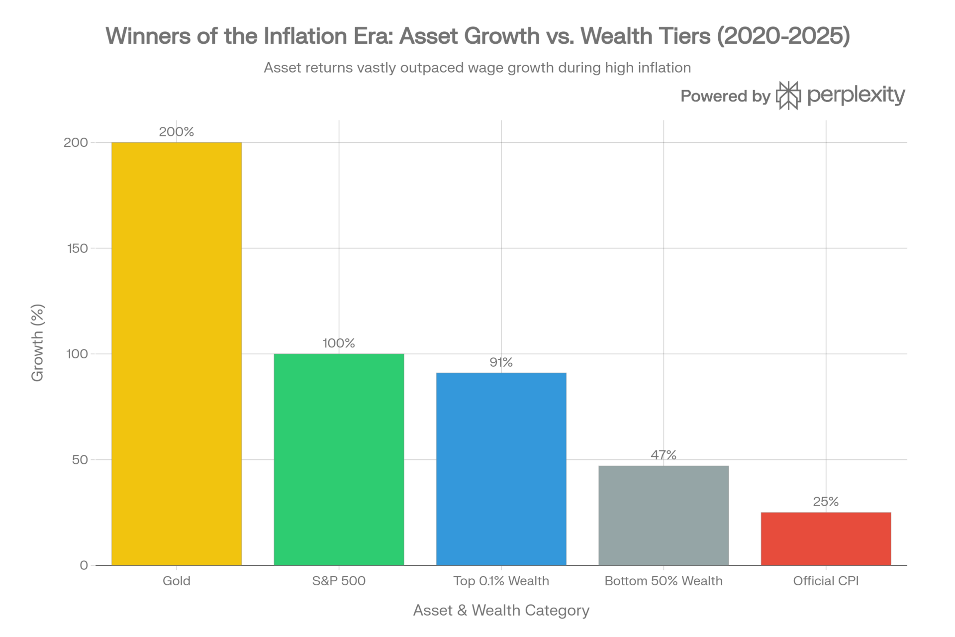 Asset inflation benefited the wealthy disproportionately. While the bottom 50% saw some growth (47%), it lagged far behind the S&P 500 (100%) and Gold (200%), explaining the wealth gap expansion