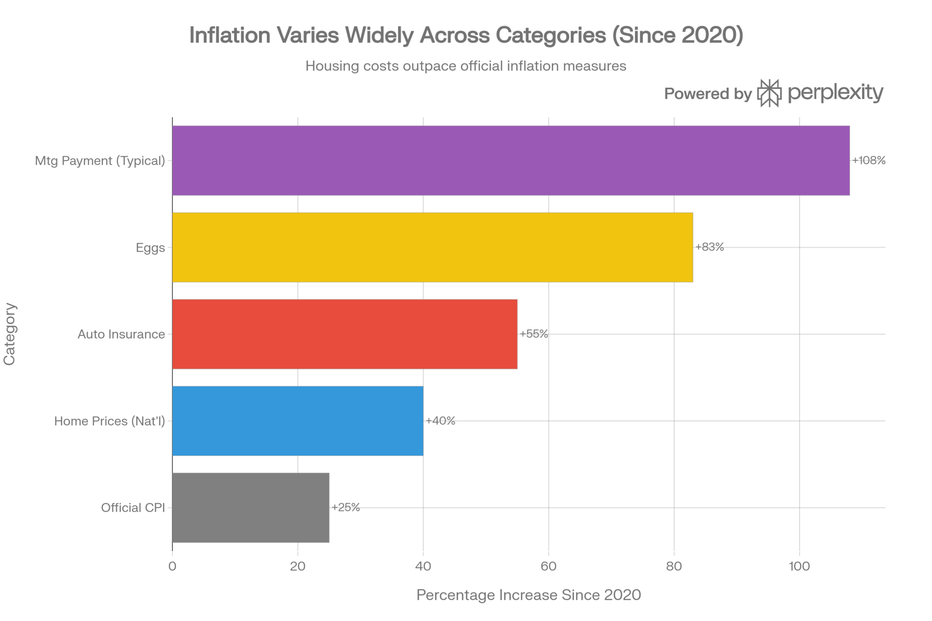 Comparison of the official CPI (25%) versus the actual price increases of major household expenses (2020–2025)