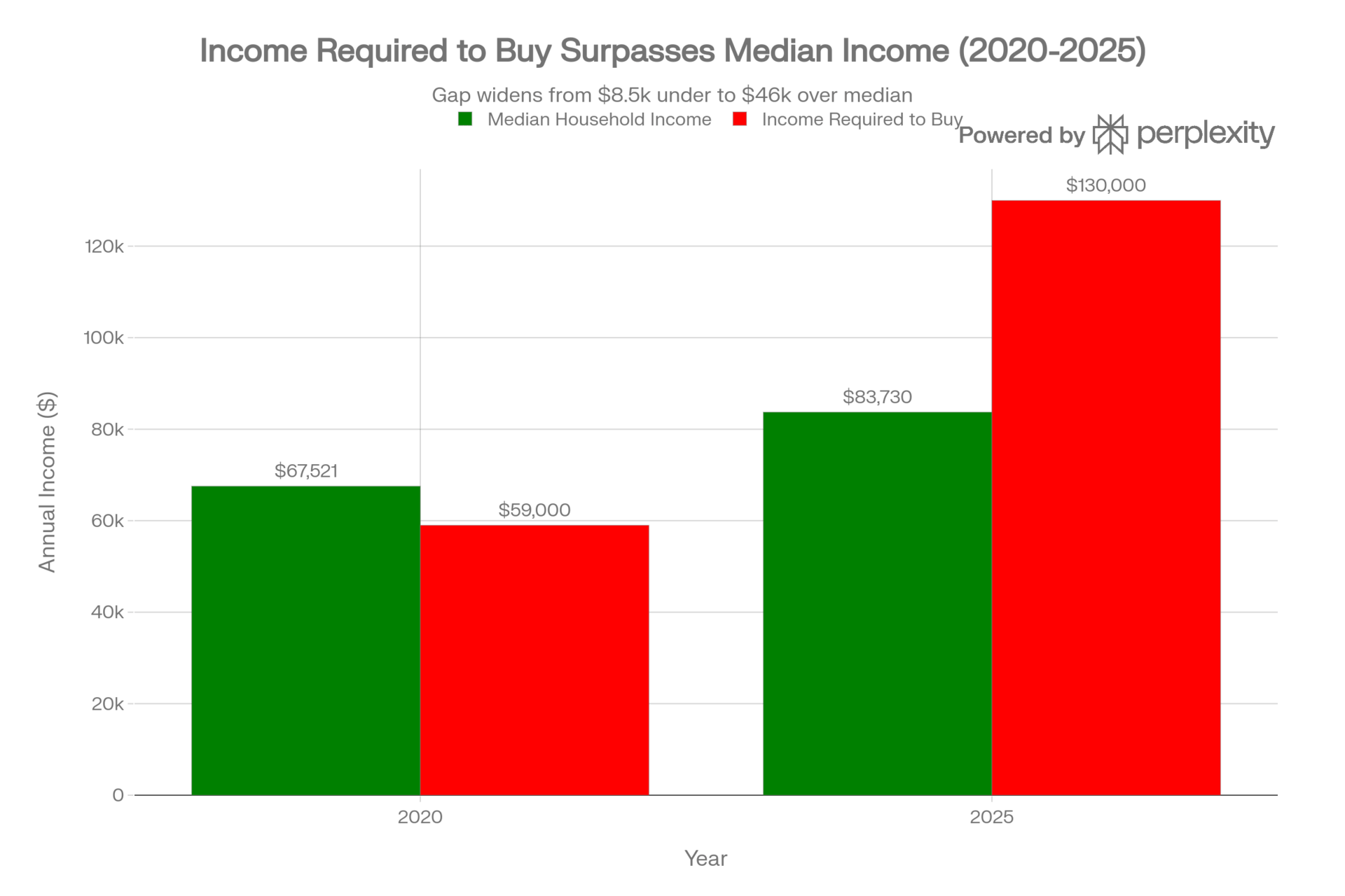The decoupling of housing costs from incomes: In 2020, the median household earned more than the income required to buy a median home. By 2025, that relationship inverted drastically