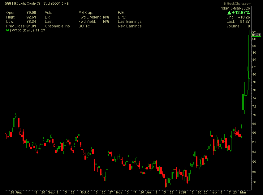 Layer oil on top. Crude closed at $90.90 Friday. The biggest weekly gain in the history of oil futures. Not the biggest in a year. The biggest ever. Trump posted that there will be no deal without Iran's unconditional surrender. That is not language that brings oil down.
